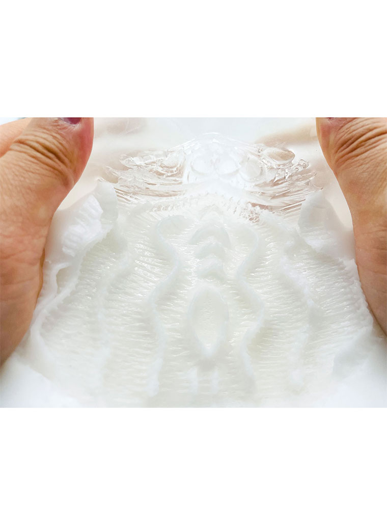 【残り3分の1~奥まで】は、見える透明素材と程良い硬さで、フィニッシュ刺激素材。フィニッシュに向けて役割の造形があるので、程良い柔らかさの素材を使用しています。程よく変形する縦ヒダの内部構造全体が、優し~く吸い付く密着感!!で、天国へフィニッシュ!!